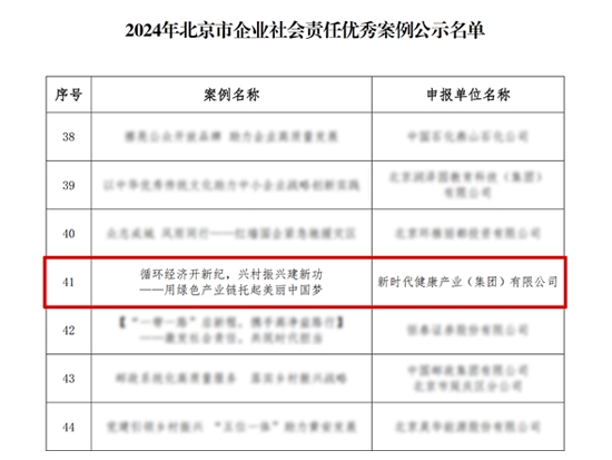 12月11日,北京企业联合会、北京市企业家协会正式发布2024年北京市企业社会责任优秀案例名单,健康产业公司申报的《循环经济开新纪 乡村振兴建新功——用绿色产业链托起美丽中国梦》赢得专家评审组一致好评,荣获“2024年北京市企业社会责任优秀案例”。